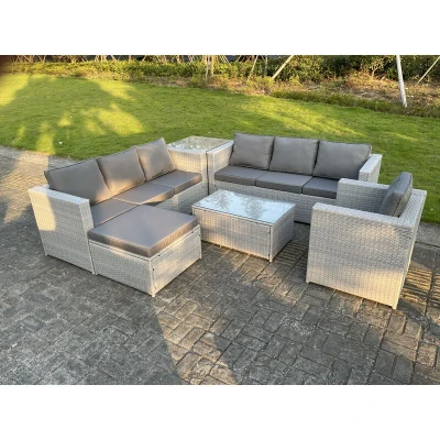 Light Grey pe Rattan Garden Furniture Set Corner Lounge Sofa Oblong Square Coffee Table Big Footstool Armchair Fimous