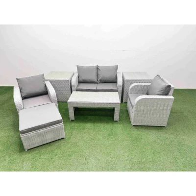 General description This deluxe PE rattan sofa set is an excellent addition to your patio or garden, crafted from high-quality PE rattan and durable galvanized steel. The set includes reclining adjustable chairs, a love sofa, a footstool, and side tables, providing both comfort and style for outdoor relaxation. Technical specifications Set dimensions: 2 x Reclining chairs: 74W x 69D x 79H cm 1 x Love Sofa: 124W x 67D x 79H cm 1 x Big footstool: 65L x 65W x 34H cm 2 x Side tables: 65L x 65W x 66H cm 1 x Coffee Table: 105L x 50W x 48H cm Sofa weight capacity: 250 kg Table weight capacity: 80 kg Color: Light grey rattan with dark grey fabric Installation Items come flat packed and are easy to assemble. Usage Adjustable armchairs allow you to change the inclination of the chair back from 90° to 130°. Low maintenance with removable cushion covers. Recommended to keep cushions indoors or use a rain cover when not in use. Other information Factory direct sale guarantees quality and