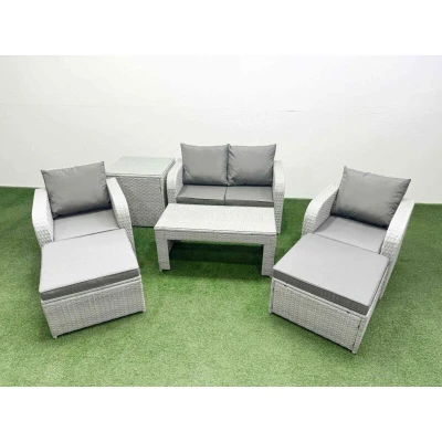 General description This deluxe PE rattan sofa set is an excellent addition to your patio or garden, crafted from high-quality PE rattan and durable galvanized steel. The set includes reclining chairs, a love sofa, footstools, and a coffee table, providing comfort and style for outdoor gatherings. Technical specifications 2 x Reclining chairs Size: 74W x 69D x 79H cm 1 x Love Sofa Size: 124W x 67D x 79H cm 2 x Big footstools Size: 65L x 65W x 34H cm 1 x Side table Size: 65L x 65W x 66H cm 1 x Coffee Table Size: 105L x 50W x 48H cm Sofa Weight Capacity: 250kg Table Weight Capacity: 80kg Color: Light grey rattan with dark grey fabric Installation Items come flat packed and are easy to assemble. Sturdy galvanized steel tube metal frames with powder coating to prevent rust. Usage The 2 armchairs are adjustable, allowing you to change the inclination of the chair back from 90° to 130°. Low maintenance with removable cushion covers. Recommended to keep cushions indoors or use a rain cover