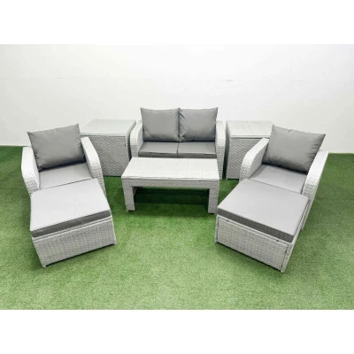 General description This deluxe PE rattan sofa set is a great addition to your patio or garden, made of high-quality PE rattan and durable galvanized steel. The set includes reclining chairs, a love sofa, footstools, side tables, and a coffee table, providing ample seating for up to six people. Technical specifications Set dimensions: 2 x Reclining chairs: 74W x 69D x 79H cm 1 x Love Sofa: 124W x 67D x 79H cm 2 x Big footstools: 65L x 65W x 34H cm 2 x Side tables: 65L x 65W x 66H cm 1 x Coffee table: 105L x 50W x 48H cm Sofa weight capacity: 250 kg Table weight capacity: 80 kg Color: Light grey rattan with dark grey fabric Installation Items come flat packed and are easy to assemble. Usage The armchairs are adjustable, allowing you to change the inclination of the chair back from 90° to 130°. Low maintenance with removable cushion covers. Keep cushions indoors or use a rain cover when not in use. Other information 5mm thick transparent tempered glass with suckers on the surface to