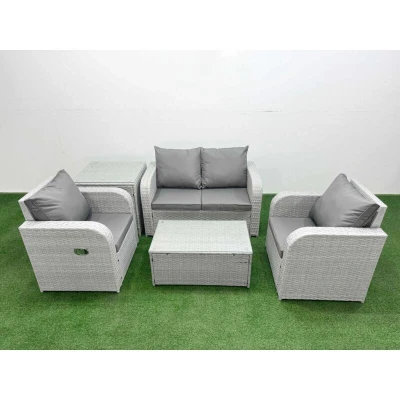 General description This deluxe 5-piece rattan sofa set is an excellent addition to your patio or garden, crafted from high-quality PE rattan and durable galvanized steel. The set includes two reclining chairs, a love sofa, a side table, and a rectangular coffee table, providing comfort and style for outdoor relaxation. Technical specifications 2 x Reclining chairs Size: 74W x 69D x 79H cm 1 x Love Sofa Size: 124W x 67D x 79H cm 1 x Side table Size: 65L x 65W x 66H cm 1 x Table Size: 85L x 50W x 37H cm Sofa Weight Capacity: 250 kg Table Weight Capacity: 80 kg Color: Light grey rattan with dark grey fabric Installation Items come flat packed and are easy to assemble. Usage The reclining chairs can be adjusted from 90° to 130° using a button. Low maintenance with removable cushion covers. Recommended to keep cushions indoors or use a rain cover when not in use. Other information 5mm thick transparent tempered glass with suckers on the surface to prevent sliding. 8 cm thick seat cushion