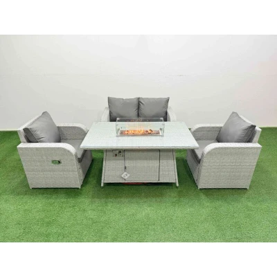 General description This Fimous Light Grey PE Wicker Rattan Garden Furniture Set includes a sofa set, reclining chairs, and a firepit dining table, designed for comfort and style in outdoor settings. The set features light grey rattan with dark grey fabric, providing a modern aesthetic for your garden or patio. Technical specifications Set dimensions: 2 x Reclining chairs: 74W x 69D x 79H cm 1 x Love Sofa: 124W x 67D x 79H cm 1 x Firepit Dining Table: 140L x 80W x 69H cm Sofa weight capacity: 250 kg Table weight capacity: 80 kg Seat cushion thickness: 8 cm Material: Flat PE Rattan, 5mm thick tempered glass Installation Items come flat packed and are easy to assemble. Includes sturdy galvanized steel tube metal frames with powder coating to prevent rust. Usage The reclining chairs can be adjusted from 90° to 130° using a button. For safety, place the gas fire pit on the glass top and not underneath it. Check for gas leaks at the joints and hose before use. Keep cushions indoors or use