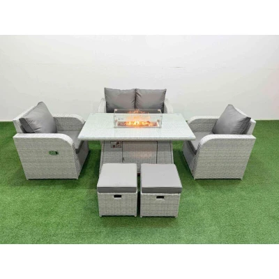 General description This Fimous Light Grey PE Wicker Rattan Garden Furniture Set includes a sofa set, reclining chairs, a firepit dining table, and two small stools, designed for outdoor comfort and style. The set features light grey rattan with dark grey fabric, providing a modern aesthetic for your garden or patio. Technical specifications Set dimensions: 2 x Reclining chairs: 74W x 69D x 79H cm 1 x Love Sofa: 124W x 67D x 79H cm 2 x Fully Assembled Stools: 40W x 40D x 34H cm 1 x Firepit Dining Table: 140L x 80W x 69H cm Sofa weight capacity: 250 kg Table weight capacity: 80 kg Material: Light grey PE rattan with dark grey fabric 5 mm thick transparent tempered glass with sucker on surface to prevent sliding 8 cm thick seat cushion with soft back cushion for added comfort Installation Items come flat packed and are easy to assemble. Sturdy galvanized steel tube metal frames with powder coating to prevent rust. Usage The two armchairs are adjustable, allowing you to change the
