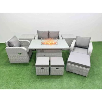 General description This Fimous Light Grey PE Wicker Rattan Garden Furniture Set is a stylish and comfortable outdoor seating solution. It includes a 7-seater configuration with 2 reclining chairs, a love sofa, 3 stools, and 2 side tables, all designed for relaxation and enjoyment in your garden or patio. The set features a gas fire pit dining table, perfect for gatherings and outdoor dining. Technical specifications Set dimensions: 2 x Reclining chairs: 74W x 69D x 79H cm 1 x Love Sofa: 124W x 67D x 79H cm 1 x Big footstool: 65L x 65W x 34H cm 2 x Fully Assembled Stools: 40W x 40D x 34H cm 2 x Side tables: 65L x 65W x 66H cm 1 x Firepit Dining Table: 140L x 80W x 69H cm Sofa weight capacity: 250kg Table weight capacity: 80kg Material: Light grey rattan with dark grey fabric Seat cushion thickness: 8 cm Glass top thickness: 5 mm tempered glass Installation Items come flat packed and are easy to assemble. Sturdy galvanized steel tube metal frames with powder coating to prevent rust.