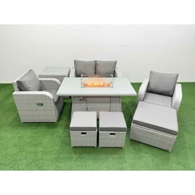 General description This Fimous Light Grey PE Wicker Rattan Garden Furniture Set is a stylish and comfortable outdoor seating solution, perfect for gatherings. The set includes two reclining chairs, a love sofa, a big footstool, two stools, a side table, and a firepit dining table, accommodating up to seven people. The light grey rattan paired with dark grey fabric offers a modern aesthetic, while the adjustable reclining chairs provide added comfort. Technical specifications Set dimensions: 2 x Reclining chairs: 74W x 69D x 79H cm 1 x Love Sofa: 124W x 67D x 79H cm 1 x Big footstool: 65L x 65W x 34H cm 2 x Fully Assembled Stools: 40W x 40D x 34H cm 1 x Side table: 65L x 65W x 66H cm 1 x Firepit Dining Table: 140L x 80W x 69H cm Sofa Weight Capacity: 250kg Table Weight Capacity: 80kg Material: Light grey PE rattan with dark grey fabric 5mm Thick Transparent Tempered Glass with Sucker on Surface 8 cm Thick Seat Cushion with Soft Back Cushion Installation Items come flat packed and are