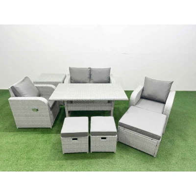 General description This deluxe PE rattan sofa set is a great addition to your patio or garden, made of high-quality PE rattan and durable galvanized steel. The set includes reclining chairs, a love sofa, stools, and a dining table, providing ample seating for up to seven people. Technical specifications Set dimensions: 2 x Reclining chairs: 74W x 69D x 79H cm 1 x Love Sofa: 124W x 67D x 79H cm 1 x Big footstool: 65L x 65W x 34H cm 2 x Fully Assembled Stools: 40W x 40D x 34H cm 1 x Side table: 65L x 65W x 66H cm 1 x Dining Table: 140L x 80W x 68H cm Sofa Weight Capacity: 250kg Table Weight Capacity: 80kg Color: Light grey rattan with dark grey fabric Installation Items come flat packed and are easy to assemble. Sturdy galvanized steel tube metal frames with powder coating to prevent rust. Usage The two armchairs are adjustable, allowing you to change the inclination of the chair back from 90° to 130°. Low maintenance with removable cushion covers. Keep cushions indoors or use a rain