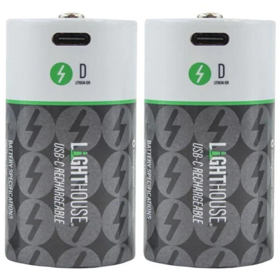 The Lighthouse USB-C Rechargeable Battery pack is designed to provide powerful and reliable energy for a wide range of devices. The included USB-A to USB-C charging cable makes recharging simple and accessible, while the charging indicator allows you to easily monitor the charging status. AA and AAA batteries have a quick 2-hour charge time. 9V, C and D batteries have a quick 2.5-hour charge time. Pack of 2 Lighthouse D USB-C Rechargeable Batteries Li-ion The Lighthouse D-type USB-C Recharge Battery Li-ion pack is designed to provide reliable and efficient power for a variety of devices. This pack includes two D-type batteries, each capable of up to 1200 charge cycles, making them a cost-effective and eco-friendly alternative to disposable batteries. The 4800mAh Li-Ion battery cell ensures extended usage times between charges, keeping your devices powered for longer. The included USB-A to USB-C charger makes recharging simple and convenient, while the charging indicator allows you to