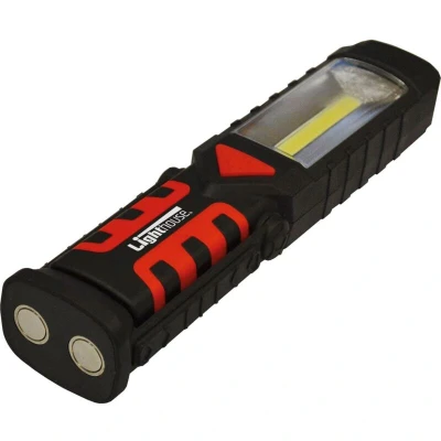 General description The Lighthouse COB LED Swivel Light & Torch is a versatile handheld light designed for various tasks at work, home, or during leisure activities. It features a COB (Chip on Board) LED work light panel on the side, a traditional spotlight at the end, and a red flashing hazard light on the back, providing multiple lighting options to suit different environments. Technical specifications Output: 120/220 lumens Colour Temperature: 6500-7000K / 7000-9000K Run Time: 6-8 hours Power Source: 3 x AAA batteries (included) Dimensions: 215 x 50 x 50 mm Weight: 170 g Compatibility and accessories Compatible with standard AAA batteries Includes 3 AAA batteries Installation No installation required; the torch is ready to use out of the box. Usage Use the main COB LED panel for broad illumination Switch to the spotlight for focused light Activate the red hazard light for warning or signaling Adjust the ratcheting magnetic base to direct light as needed Hang the torch using the