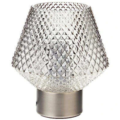 Innovative embossed glass table lamp will make this gorgeous little lamp a focal point in your home Finished in a smoked colour and complementing chrome base this lamp will give a wow effect Requires 1 x 7W E27 Golf ball -LED bulb - not included Full of character this lamp will make a great addition to any room Measurements: H16.5 x W15 x L15cm
