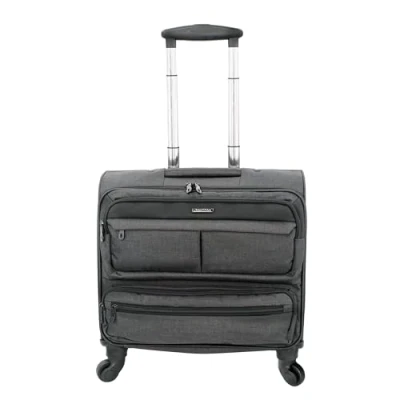 The Lighpak trolley case made of durable 600D nylon in anthracite is a high-quality business case as a consistent development of classic travel suitcase and an ideal travel companion The smart fabric case withstands even rough treatments caused by air travel and has smooth zips and an address field on the back The travel trolley has a fully retractable telescopic trolley system up to 105 cm, an ergonomic carry handle and four 360° smooth-running wheels, ideal for moving the overnight case comfortably Inside, the practical piece of luggage impresses with a large overnight compartment with packing straps and a padded laptop compartment up to 17 inch notebooks, outside with zip front pockets and organiser compartment Outer dimensions: approx. 44.5 x 44 x 24.5 cm, inner dimensions of laptop compartment: approx. 30 x 40.5 x 4 cm, weight: 2.9 kg, material: 600D nylon, telescopic height: 105 cm, colour: anthracite, wheels: 4 x 360°, item number: 46144