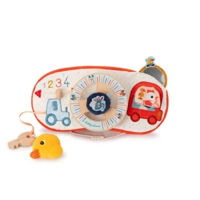 LILLIPUTIENS Baby Activity Panel Perfect for Car Rides Interactive Toy with Steering Wheel, Key, and Mirror Busy Board Stimulates Motor Skills Imagination From 12 Months 83526