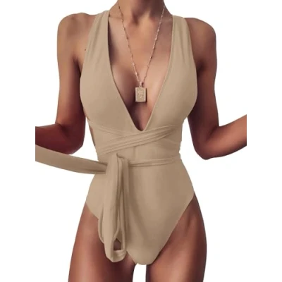 Lilosy Sexy Tie Criss Cross Plunge One Piece Thong Swimsuit High Cut Brazilian Bathing Suit, Khaki, Medium
