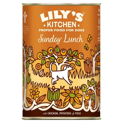 Lily's Kitchen Sunday Lunch Proper Dog Food 400g is a grain-free, nutritionally complete wet food for adult dogs, made with 60% fresh chicken, vegetables, and herbs. Ideal for sensitive digestion, it contains no artificial additives and supports balanced health and wellbeing.