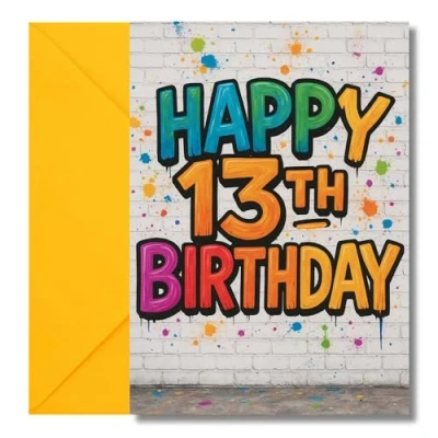 SUPER HIGH QUALITY 🎉 This 13th birthday card folds to A5 and is printed on premium 300gsm card. It’s blank inside so you can write your own message and comes with a bold coloured envelope. Great quality for a great milestone. AWESOME FOR NEW TEENS 😎 Perfect as a son 13th birthday card, nephew 13th birthday card, or even for a brother or grandson. Designed with teen vibes in mind—cool, colourful and just the right amount of attitude. GRAFFITI-STYLE DESIGN 🎨 This fun and bright 13 birthday card features graffiti lettering and a brick wall background. Great for boys who love bold colours, street art, or just something a bit different from the usual. PAIR IT WITH A GIFT 🎁 Looking for 13th birthday gifts for boys? This card makes a brilliant add-on. Fun and full of character, it brings that extra laugh or grin to any birthday celebration. FOR ANY 13-YEAR-OLD BOY 💥 Whether it’s for your son, brother, grandson or nephew, this 13th birthday card boy design is a solid choice. Bright, modern and full of teen energy—just like him!