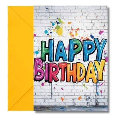 SUPER HIGH QUALITY 🎨 – Printed on thick 300gsm card with a smooth, professional finish, this boys birthday card is made to stand out. It’s A5 when folded, blank inside for your own message, and comes with a colourful envelope. Great choice for a birthday boy card, whether he’s turning 10, 11, 12, 13, or even 16. A bold design that feels fun and fresh – just like him! GRAFFITI STYLE FUN 😎 – The bright, paint-splattered graffiti design makes this a happy birthday card boy will actually love. No boring cartoons or cheesy messages – just cool, street-inspired style. Whether it’s a boy birthday card or teenage boy birthday card, this one's got the attitude and colour to match his big day. FOR ALL AGES 🧢 – Perfect for a 10th birthday card, 11th birthday card, 12th, 13th, 14th, 15th, or 16th birthday card. This design works for little kids and teens alike. If you're looking for birthday cards for teenage boys or younger boys with a sense of style, this one's a winner. Great for birthdays that feel a bit more grown up! PERFECT FOR FAMILY 💙 – Whether it’s for your son, grandson, or nephew, this card hits the sweet spot between fun and cool. An ideal pick when you want a birthday card boys will be excited to open – and maybe even keep. Simple, stylish, and full of energy, just like the special guy you’re buying for. FUN MEETS MODERN 💥 – Ditch the dull and go bold with this colourful, urban-inspired card. Ideal for anyone shopping for boys birthday cards, teenager birthday card, or even birthday cards for men with a youthful vibe. It’s bright, fun, and packed with personality – ready to celebrate a birthday in style!