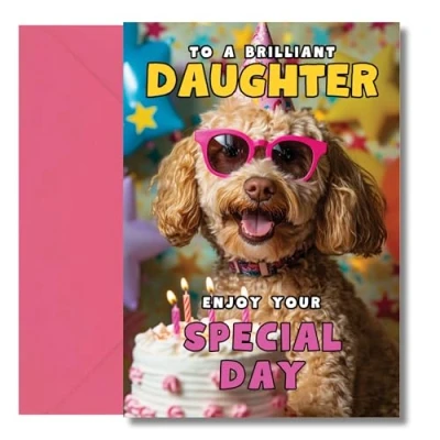 SUPER HIGH QUALITY π β This daughter birthday card is printed on thick 300gsm cardstock for a premium feel. A5 when folded, making it the perfect size to stand out! The inside is blank, so you can add your own heartfelt or funny message. Comes with a bright coloured envelope to complete the look. ADORABLE & FUN DESIGN πΆ β Featuring a cute cockapoo in pink sunglasses with a birthday cake, this birthday card for daughter is a perfect mix of sweet and stylish! A great way to make her feel extra special on her big day. PERFECT FOR ALL AGES π β Whether sheβs celebrating her 11th, 12th, 13th, 14th, 15th, 16th, 18th, 21st, 30th, or 40th birthday, this daughter card birthday is a fun and thoughtful way to send your love. GREAT FOR FUN-LOVING DAUGHTERS π β If you're after a birthday card daughter funny, this playful design is a perfect choice! A great way to bring a smile to her face, no matter how old she is. A SPECIAL TOUCH FOR HER DAY π β Looking for birthday cards for daughter that stand out? This cute and stylish design is perfect for parents who want to make their daughterβs birthday even more memorable!