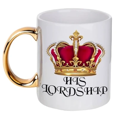 Perfect for the King in Your Life: This "His Lordship" mug with a regal crown graphic is an ideal choice for any man who loves a good laugh and a touch of royal style. It's the perfect man mug for his morning coffee or tea ritual. A Bold Gold Handle: The striking gold handle on this funny mug for men adds a classy touch, making it stand out in his mug collection. It's more than just a novelty mug—it's a fun way to add a bit of humor and style to any morning routine. Printed on Both Sides: No matter how you hold it, this novelty cup for men proudly displays "His Lordship" on both sides, giving everyone a clear view of his "royal status." Gift-Ready for Any Occasion: Looking for the perfect husband mug, boss mug, or just a funny gift? This king mug makes a fantastic present for birthdays, Father’s Day, or any day he could use a smile! Easy Care in Mind: Hand-wash only to keep the "His Lordship" design and gold handle in top condition. Not dishwasher or microwave safe, so treat it with royal care!, Manufacturer: LimaLima