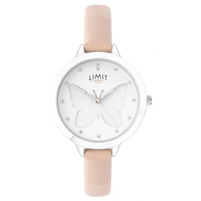 Pearlescent white butterfly design dial Stone set dial Butterfly feature Pink strap