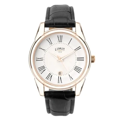 Limit Gents watch with a 40 mm round alloy case in warm rose-gold plating and a refined white matte dial – a timeless accessory for work events or everyday wear Embossed cross-checked centre bold black Roman numerals inner minute track and a framed date window above 6 o’clock for quick clear time and date reference Matching rose-gold hour, minute and sweeping second hands add a touch of luxury and contrast beautifully with the crisp white dial Wrapped and padded black PU strap with classic crocodile texture tapered end and rose-gold stainless-steel pin buckle for a secure comfortable fit Precise quartz analogue movement powered by a long-life SR626SW battery weighing only 46g and backed by Limit’s 2-year manufacturer’s warranty an ideal affordable gift