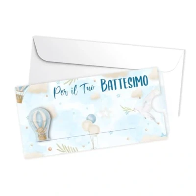 ELEGANT DESIGN: Christening card with delicate hot air balloons and clouds pattern on a sky blue background, perfect for celebrating a child's christening COMPLETE SET: Includes decorative card, matching white envelope and dedicated space to write your own personal message ARTISTIC DETAILS: Fine illustrations with hot air balloons, doves and stars in light blue and beige hues for a delicate and dreamy effect Practical format: Sliding card with ample space for greetings and ideal size to hold a gift bag SUPERIOR QUALITY: Printed on high quality paper with professional finish to ensure a stylish and long-lasting result