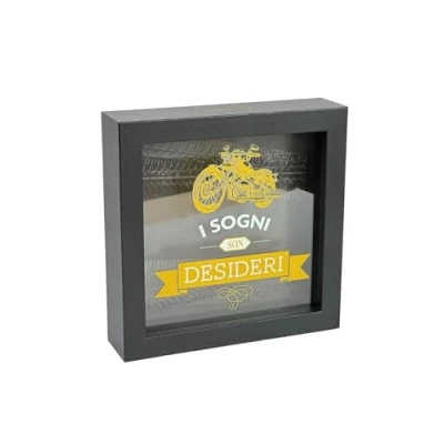 ELEGANT DESIGN: Modern style decorative money box with black frame and glass front, perfect for home or office decor PRECISE SIZE: Measures 16cm x 16cm, ideal size to be placed on shelves, desks or bedside tables MOTIVATIONAL THEME: Decorated with a golden motorcycle and the inspirational phrase 'Dreams Son Desires' to encourage savings REFINED DETAILS: Yellow and white graphics on grey background with tyre pattern, top slot to insert coins ROBUST STRUCTURE: Made with durable black wood frame and protective glass panel for long life