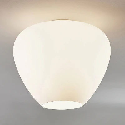 Lights.coWhite Bibiane glass ceiling lamp with a round shape With its round glass lampshade, Bibiane is the epitome of timelessness and is characterised by an exclusive harmony. It is said that the ceiling light cannot look out of place anywhere, as it has such a stylish, harmonious appearance. However, the round shape tapers towards the bottom, giving the light a special and very individual look. This is one reason why the glass ceiling light always catches the eye so pleasantly. The light is warm and even, which means that the atmosphere is always pleasant and cosy.