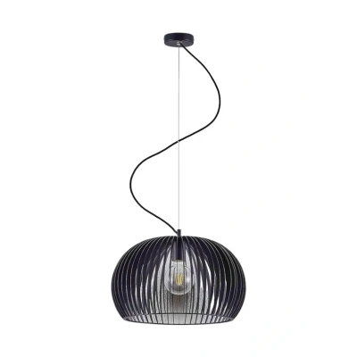Lights.coGreat Jusra pendant light with a black finish and effective light emission Jusra goes perfectly with modern interiors and presents itself as a particularly stylish hanging light with a trendy cage look. The black, slightly curved metal rods are arranged around the lampshade like slats, creating a kind of sphere that forms the shade of the pendant light. The light is emitted outwards with interesting shimmering effects and appears slightly dimmed. Thanks to the open lampshade, the light is emitted downwards unhindered, making Jusra ideal for illuminating a dining table.