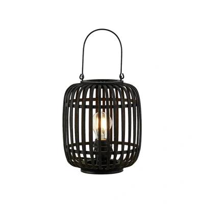 Lights.coCanyana table lamp with black rattan shade The Canyana table lamp was designed entirely in black in the shape of a lantern. The table lamp can be easily moved from one place to another thanks to the metal bracket at the top of the lampshade and conjures up an enchanting ambience in the most diverse areas of the home thanks to the play of light and shadow created by the bulb (not included) in the E27 socket thanks to the shade design consisting of individual struts with many spaces in between.