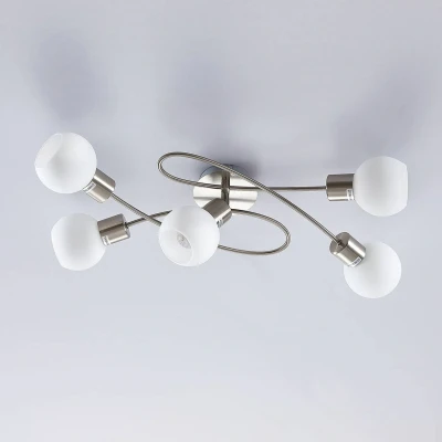 Opal glass ceiling light Elaina with E14 sockets Elaina is an exceptionally beautiful ceiling light for living spaces with a modern style. Equipped with 5 opal glass globes, behind each of which an E14 bulb can be inserted, the ceiling light produces a pleasantly bright light that suits many rooms. The curved metal frame with a matt nickel finish is particularly attractive, giving the ceiling light a dynamic look.