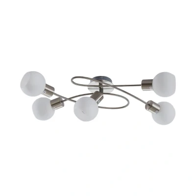 Lights.coOpal glass ceiling light Elaina with E14 sockets Elaina is an exceptionally beautiful ceiling light for living spaces with a modern style. Equipped with 5 opal glass globes, behind each of which an E14 bulb can be inserted, the ceiling light produces a pleasantly bright light that suits many rooms. The curved metal frame with a matt nickel finish is particularly attractive, giving the ceiling light a dynamic look.