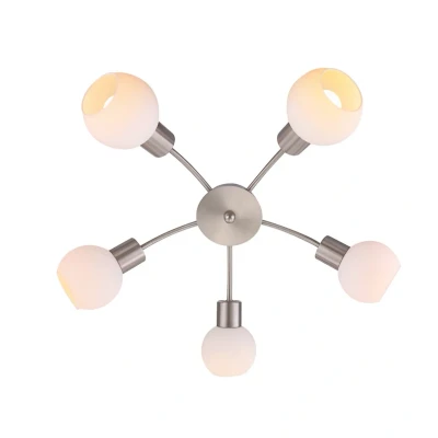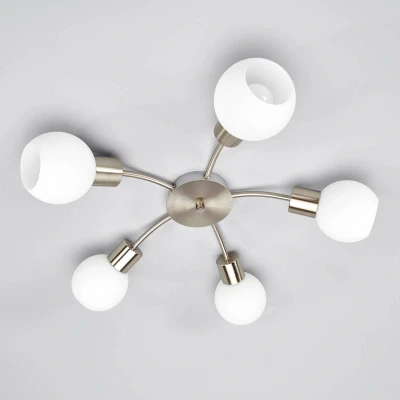 Lights.co5-bulb Elaina ceiling light with matt metal frame Five opal glass shades adorn this ceiling light, which is operated with E14 bulbs. There is no doubt that this creates a particularly cosy light that is perceived as pleasant and inviting, especially in private living spaces. If you are keen to keep energy consumption low despite adequate brightness, you can fit the Elaina ceiling light with E14 LED bulbs, as these consume only a fraction of the electricity required to produce the same brightness compared to their well-known predecessor, the traditional light bulb.