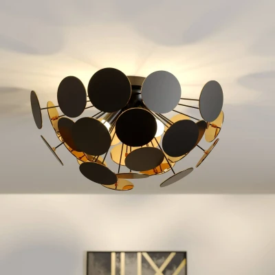Lights.coTrendy Kinan ceiling lamp with black and gold plastic discs Some lights have conventional lampshades that have been around since the dawn of electric lighting, but this ceiling lamp is not one of them, because the structure that fits around the bulb is made up of many round discs that are black on the outside but painted gold on the inside. There is enough space between them to allow the light to penetrate the room and, of course, the optic of circles and spaces is also reflected in the room, where you can see light and shadow at the same time when the ceiling lamp is switched on. The gold-coloured inside makes the light appear warmer, which naturally contributes to a higher cosiness factor.