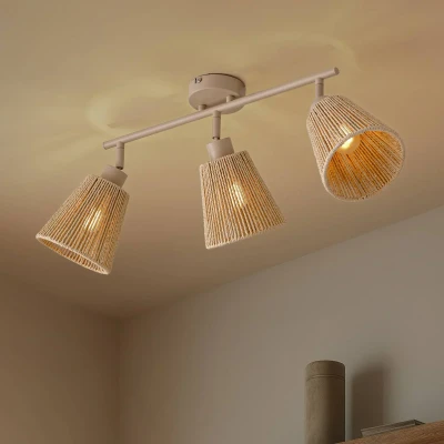 General description The Anuva ceiling spotlight combines Scandinavian design with functional versatility. Made from a combination of paper and metal, it radiates natural elegance that harmonizes with various living spaces such as living rooms and dining rooms. The beige color scheme emphasizes the subtle design, creating a warm and inviting atmosphere. With an impressive swivel range of 350.90 degrees, the light sources can be flexibly aligned to suit your needs. Technical specifications Material: Paper and metal Length: 72 cm Swivel range: 350.90 degrees Bulb type: 3 bulbs (not included) Installation Requires an external dimmer switch for dimming functionality (not included). Usage Easily adjust the light intensity in your room with an extra dimmer switch. Ideal for creating a cozy and warm atmosphere in your home. Other information