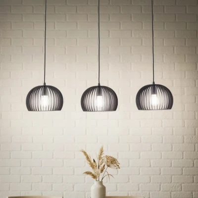 The Jusra 3 Pendant Lamp Black immediately catches the eye with its eye-catching cage lampshades. These consist of slats of black-painted metal arranged in a voluminous dome around the light source. As the light source is visible, it is the luminous centrepiece of the lamp's design. Therefore, it is a good idea to use a filament light bulb or other decorative models that support the overall look.