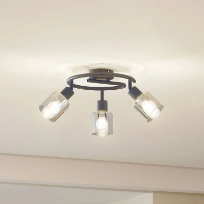 Lights.co3-bulb Netty ceiling light with smoky grey lampshade The Netty ceiling light combines modern design with the elegance of smoky grey glass to create an atmosphere that is both cosy and inspiring. Ideal for use in the dining room, living room or hallway, this lighting element sets stylish accents and helps to increase productivity. The light source is not only a visual eye-catcher, but also influences the mood in the room by varying from calming to energising nuances. Although a dimmer is not included, the intensity of the light can be adjusted via an external dimmer to create the perfect ambience (please note that an external dimmer must be purchased separately) - the spotlights can be swivelled 90° and rotated 350°