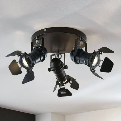 The Tilen ceiling light showcases a stylish industrial design, reminiscent of classic stage spotlights. Its three rotatable and swiveling spotlights mimic the iconic look of old lighting used in theaters and photography studios. This not only adds a touch of charm to your decor but also serves a practical purpose in directing light where it is needed most. The decorative flaps help create a distinctive look while contributing to efficient room illumination, making it perfect for living rooms, dining areas, or even hallways.