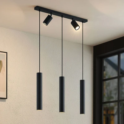 Lights.coStylish Sanad hanging light made of black steel in an elongated shape The Sanad hanging light impresses with its fashionable appearance and simple colour scheme. Three hangers are attached to an elongated ceiling canopy, each of which holds a tubular lampshade. Between these hangers, there is another lampshade directly attached to the ceiling canopy, which makes the design of the light something special. The lampshades can be fitted with GU10 bulbs, which provide the necessary lighting. The spacious size of the Sanad pendant light and its modern design can be easily integrated into a wide variety of interior styles. With its striking character, it transforms any room into something very special and complements the rest of the furniture.
