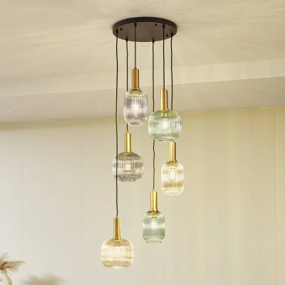 Lindby Doroteo pendant light, 6 bulb, green/amber/grey, glass