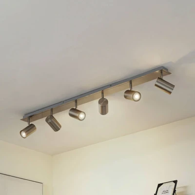 Nickel-coloured Joffrey downlight with six cylindrical lampshades This spot can be used to beautifully accentuate your home. The Joffrey model allows you to adjust the brightness to your own liking using an external dimmable, is made to accommodate bulbs with a GU10 base and is perfect for any dining room, living room or hallway. It impresses with the outstanding quality and excellent design of the Lindby brand. The lamp cuts an outstanding figure with its modern style and comes in the colour nickel. With this light, you can add the finishing touch to your own four walls.