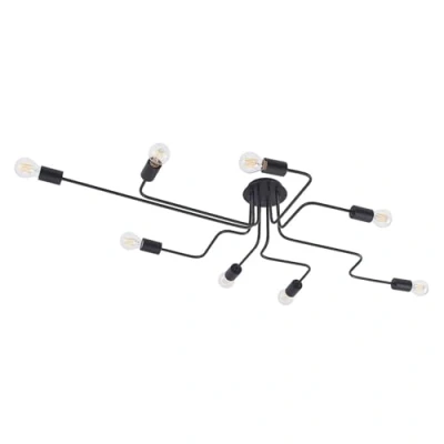 Lights.coElimar ceiling lamp made of iron steel with eight light sources The Elimar ceiling light has a very individual design that immediately catches the eye. Its frame was made of iron steel and is accordingly robust. The eight light sources provide good illumination and can also provide enough light in the dark in larger room areas. The black look is striking, especially since a lampshade was completely omitted. This allows the light to unfold unhindered throughout the room. The E27 bulbs to be used should therefore be chosen carefully to emphasize the decorative character of this lamp.