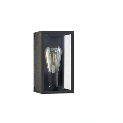 Filimon Dark Grey Outdoor Wall Light has a stylish look that combines classic and modern elements. The lamp has a traditional lantern shape with a dark metal frame that beautifully frames the light source. The spaces between the frame are fitted with glass inserts that are completely transparent so that the light bulb is visible from all sides and can therefore emit a clear and direct light in all directions. The lamp head has a strict box shape consisting of straight lines and right angles that add a modern look to the overall design.