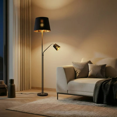 General description This stylish Efalia floor lamp features a modern industrial design, making it a perfect addition to your living room, dining room, or office. Its elegant black and gold color scheme adds a sophisticated touch to any space, enhancing the modern vibe of your loft, apartment, or house. Technical specifications Material: Metal Color: Black and Gold Base: Round, sturdy base made of black steel Main light socket: E27 Reading light socket: E14 Installation Includes a switch for easy on/off operation. Usage Ideal for providing ambient lighting in living rooms or bedrooms. The additional reading light offers targeted illumination, perfect for reading or focused tasks. Other information