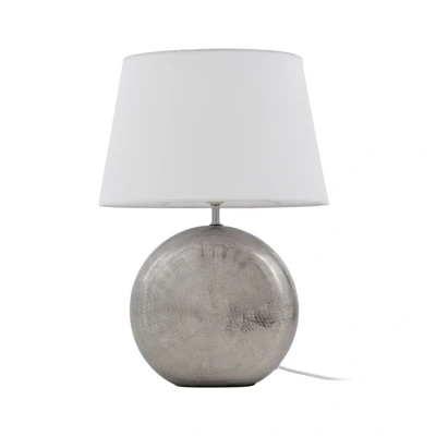 Lights.coElegant Florentino table lamp with bulbous ceramic base in silver and white fabric shade This table lamp is a beautiful all-rounder, especially for classic settings. The lampshade tapers slightly towards the top, is oval when viewed from above and is made of white fabric, which provides a very soft, cosy light. The base, on the other hand, is more like a flattened sphere and is made of fine ceramic with an attractive textured silver finish. The two components result in a beautiful, rather classic appearance and Florentino is without doubt a light source that can be used perfectly for evening accent lighting and adds a cosy touch to the surrounding ambience.