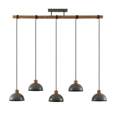 Durbis 5 Pendant Dark Grey/Wood combines industrial style with modern aesthetics in a beautiful union that easily fits into the interior thanks to its simple design and neutral colour scheme. The lamp has a relatively sturdy appearance due to the robust materials used in the design, as the combination of wood and iron gives the lamp a nice weight and a solid appearance. The frame consists of a wooden crossbar that holds the cables for each lampshade. The cables can be wrapped several or fewer times around the crossbar, allowing you to determine the height of each light source. For example, you can let all lamps hang at the same height for a balanced look or vary them alternately or in a decorative staircase formation.