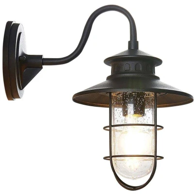 Lights.coRustic outdoor wall light Kyan with glass insert The Kyan outdoor wall light has a shape with antique charm and can harmonise particularly well with older, historic buildings. The bulb, which is not included and can be selected by the user, is protected by a glass cover. The additional metal grille is very decorative on the one hand and offers a little more protection against adversity on the other. The Kyan outdoor light also has a very attractive arched shape and looks great at house entrances, terraces or on verandas, for example.