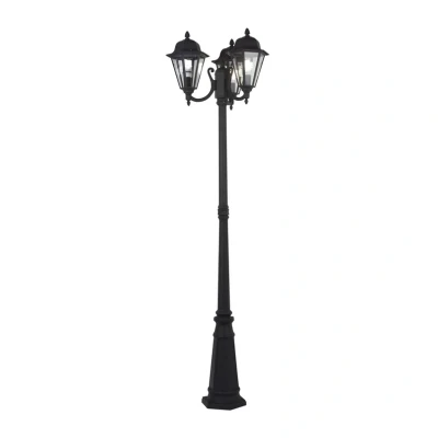 Lights.coEdana 3-bulb lamp post with intricate design This lamp post is a charming light source for outdoor areas, boasting an antique-style appearance. The lampshades with roof-shaped covers feature intricate designs and are clearly reminiscent of the lanterns that used to light streets and parks before electric lighting was even conceivable. The metal frame has a subtle graphite grey finish and the clear lampshade inserts are made of glass.