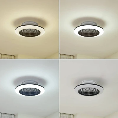Lights.coModern ceiling fan with LED lighting, dimmable, controllable light colour The Mamuti LED ceiling fan combines modern design with great functionality. The LED lighting is dimmable by remote control and the light colour (white) can be controlled. The different speeds of the fan can also be controlled with this. Technical details Power per speed: - 35 watts at 1140 rpm - 30.4 watts at 950 rpm - 27.2 watts at 760 rpm - Maximum volume flow: 32.73 m³/min - Maximum air speed: 2.23 m/sec - Fan sound power level: 47.1 dB (A) - Service value (SV): 1.07 (m³/min)/W