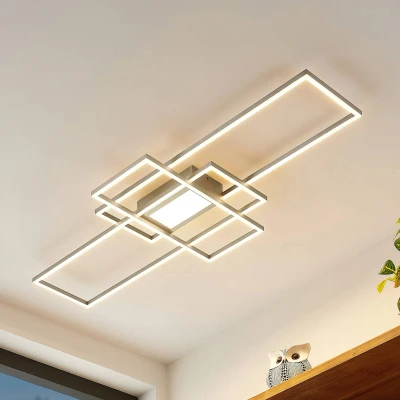Lights.coNickel-coloured LED ceiling light Caitlin in a playful design The LED ceiling lamp Caitlin impresses with its fashionable design and interesting look. It consists of three rectangular frames, which are attached to a ceiling canopy one above the other and overlap. Inside these elements are permanently installed LEDs which provide the corresponding light. The light colour can be effortlessly controlled from 3,000 K - 6,000 K using a remote control. This always provides the right light at the right moment. With its discreet colour scheme and attractive design, the Caitlin LED ceiling light can be effortlessly integrated into modern furnishing styles and complements the furniture beautifully. With its expansive size, it spreads the light widely throughout the room and creates a harmonious ambience.