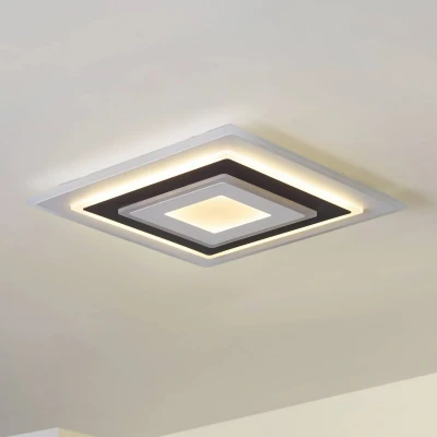 Lights.coRebeka square LED ceiling light in a flat design The Rebeka LED ceiling light combines modern design with functional versatility and is made of high-quality metal and acrylic. Its surface is visually distinguished by squares of different sizes in white and black. The integrated LED light source provides uniform light and can be easily controlled using the included remote control. Thanks to the CCT function, the light colour can be flexibly adjusted from warm white light (2,700 K) to daylight-like light (6,500 K). In addition, the light brightness can be continuously adjusted. This allows you to set the optimal lighting mood at any time to showcase the room.