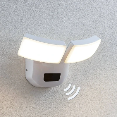 2-bulb LED outdoor wall spotlight Nikias with sensor and movable heads, seawater resistant This LED outdoor wall spotlight has a white surface and is characterised by its high level of functionality. The two heads can be rotated and swivelled (90° horizontally/180° vertically) so that the light can be precisely aligned. A motion detector is also integrated so that the light reacts to movement in the surroundings and switches on immediately when light is required. The light is seawater resistant and has an IK06 impact resistance rating, making it particularly robust. Sensor data: - Range 12 m x 6 m - Light duration adjustable (5 s/90 s/5 min/15 min) - Detection angle 150°
